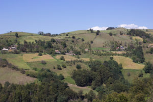 V Rovensku, konkrétně na té návsi, jsme strávili asi půl hodiny. Ještě nás dnes ale čeká přechod do nejbližší sousední vesnice, totiž dalších patnáct kilometrů do Gerníku. Takže chtě nechtě musíme zase vyrazit. Je pravda, že teď už je cesta lepší, jdeme většinou po polních či lesních cestách, které jsou sjízdné i pro povozy s koňmi či traktory. Pochopitelně už ani tolik nejdeme do kopce, naopak do Gerníku sestoupáme 400 výškových metrů, ovšem ani chůze z prudkého kopce není žádná výhra. Oproti předchozím dvěma dnům, kdy jsme se potulovali kolem řeky Nery, jsme teď naopak na horských (tak jo, na kopcovitých) hřebenech, takže si užíváme zase trochu jiných výhledů. Má to tu, věru, něco do sebe.