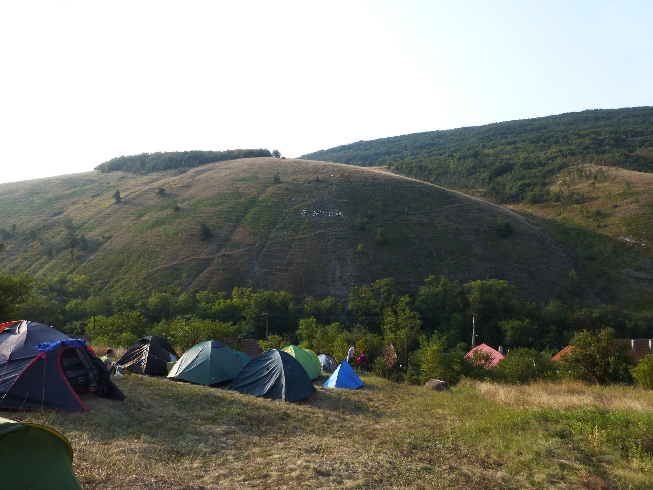 Ocitli jsme se tedy v zemi zaslíbené, U Medvěda. To je ta hospoda s malým penzionkem, kterou si naši průvodci v roce 2007 koupili, zrekonstruovali, a která slouží jako základna pro všechny výlety, které s turisty podnikají. Za hospodou je úzký lán políčka, kde jsme rozbili stany. Jelikož v Banátu roviny prakticky nejsou, je i toto políčko v příkrém svahu, ale kluci tu alespoň několik kousků srovnali a vytvořili tak jakési terasy, na kterých lze stany pohodlně postavit. Kromě toho tu jsou kontejnery na odpadky a asi dvě kadibudky. Zabrali jsme si místa co nejdál od nich, protože je nechceme čuchat tři noci. Každopádně sociální zařízení v podobě sudové sprchy a opravdických toalet a vlastně i zbytek hospody a vesnice je dole pod strání, čili jen dostat se do stanu znamenalo značný výkon a překonání asi desetimetrového převýšení. Jenže rovina tu prostě není.